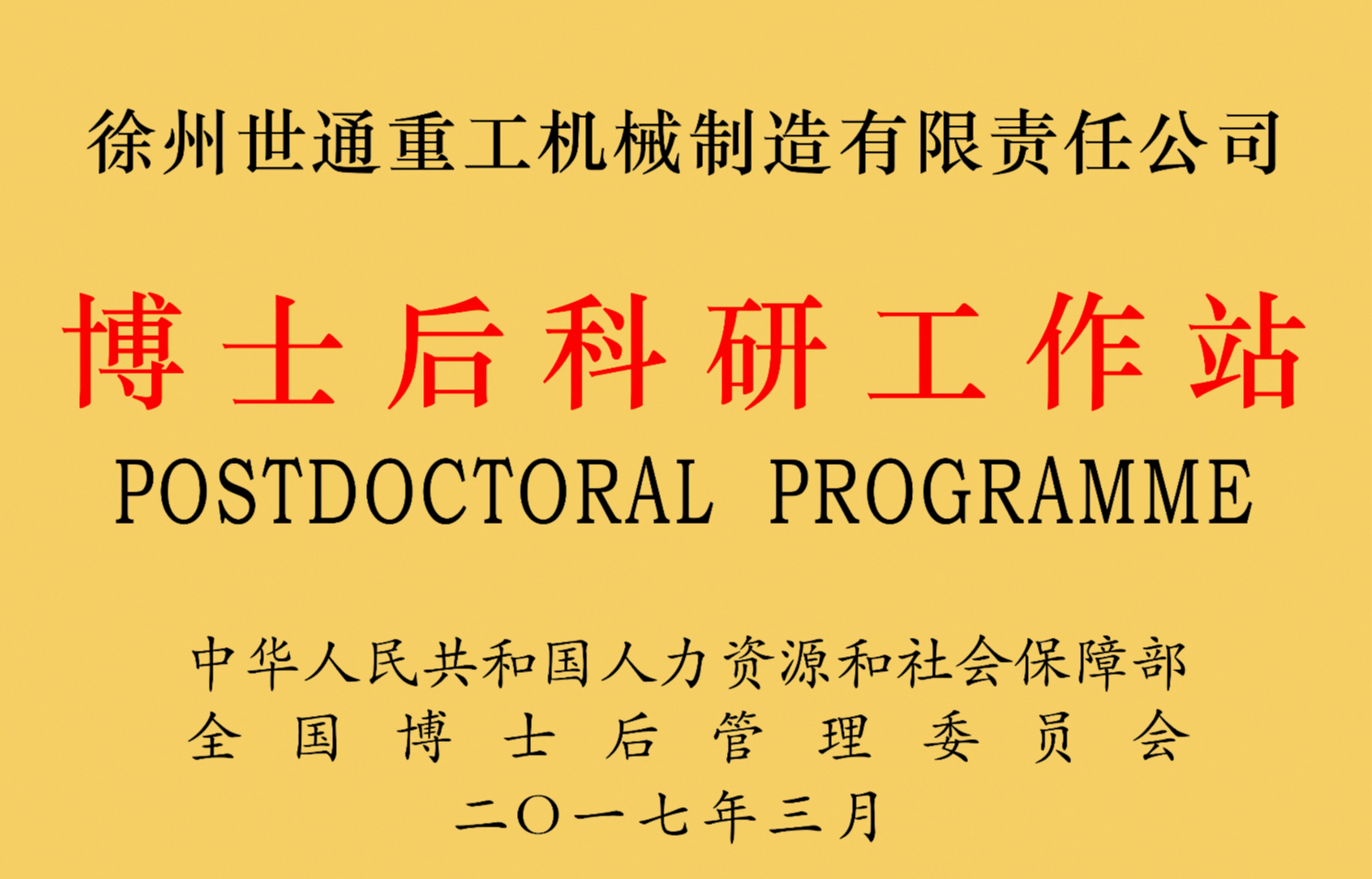 2017年3月,全國(guó)博士后管委會(huì)辦公室發(fā)布了關(guān)于批準(zhǔn)增設(shè)博士后科研工作站分站的通知(博管辦〔2017〕24號(hào))。世通重工被批準(zhǔn)在江蘇省徐州市經(jīng)濟(jì)技術(shù)開(kāi)發(fā)區(qū)設(shè)立博士后科研工作站分站。我司是2016年至今徐州經(jīng)濟(jì)技術(shù)開(kāi)發(fā)區(qū)唯一獲批的博士后科研工作站。